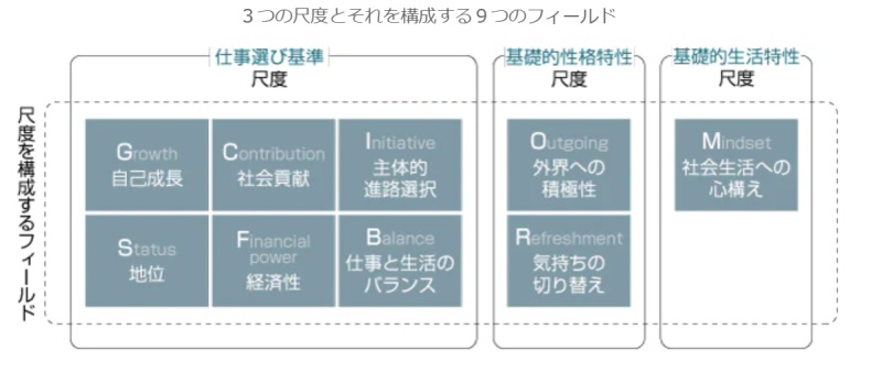 | 利用場面 | 大学等の高等教育課程や就職支援機関等の就職指導・就職支援等。 就職先や進路を具体的に考えるときのポイントとなる「働き方に対する考え」や「仕事に取り組む姿勢と特性」を測定。 |